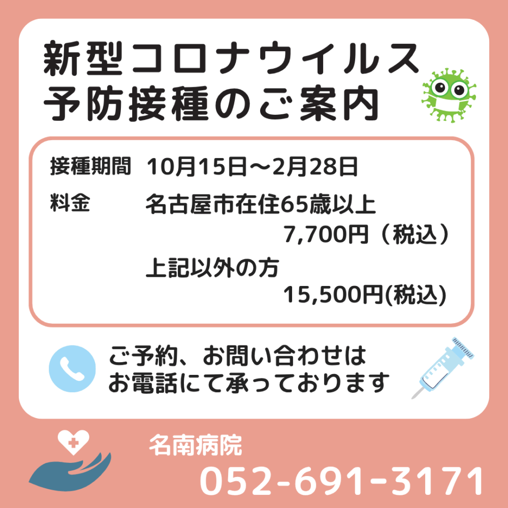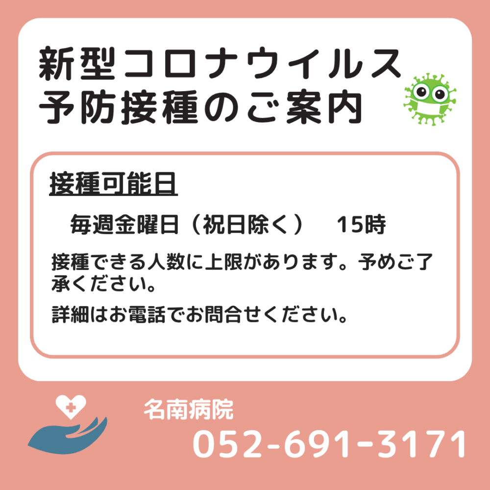 既に予約を受け付けておりますので、電話または受診の際に予約をお願いします。